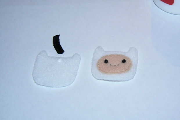 Pegar un pequeño trozo de cinta doblado por la mitad, en la parte posterior de la cabeza. Coser las piezas cabeza cerradas, cogiendo el cuerpo entre las piezas en el cuello. Agregue algún relleno y cierre.