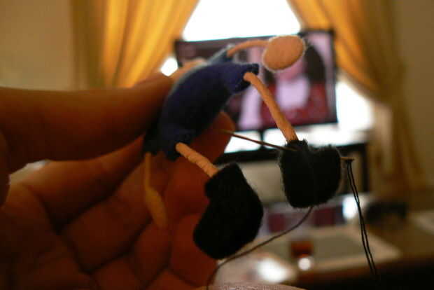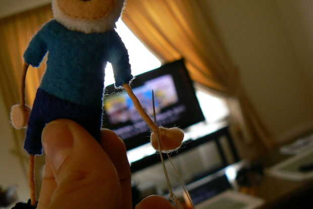 Cortar las piernas a la longitud que desea. Añadir dos puntos de pegamento para unir los pies de fieltro. Coser alrededor de los pedazos del pie para garantizar.