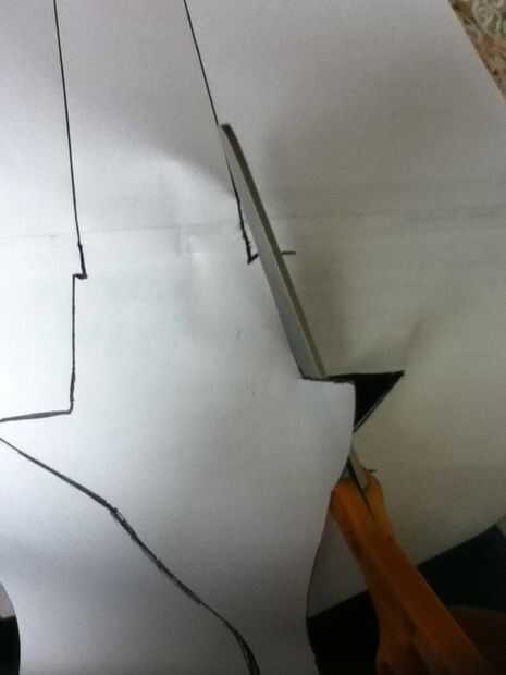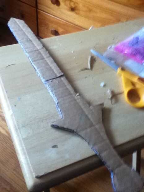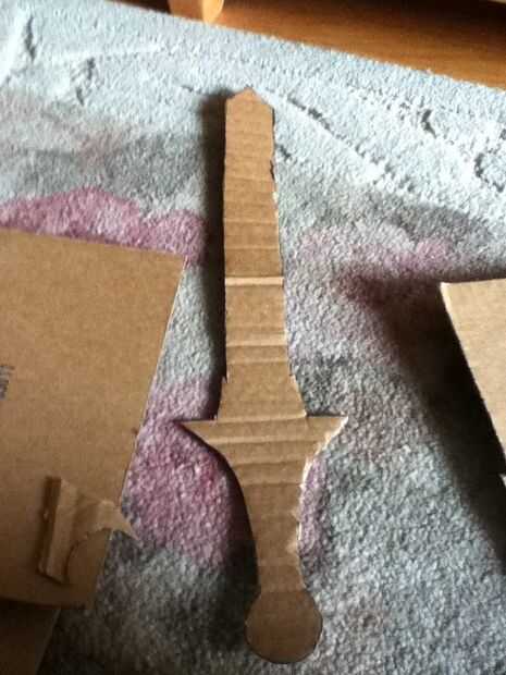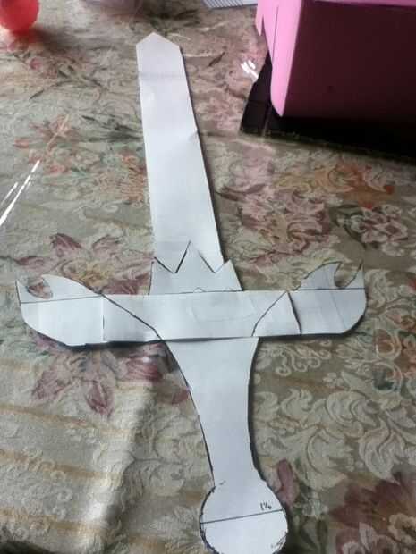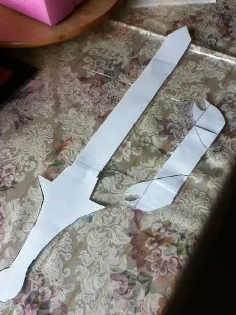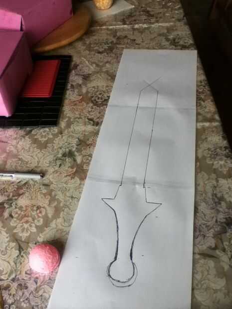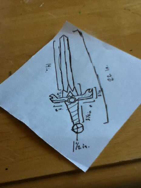 Utilizando los cuadros de referencia empezar a dibujar un esquema en un papel que ha sido grabado junto. Tengo unas medidas de la hoja es de 14 pulg, los mientras que espada es de 22 pulg, las "armas" que se pega hacia fuera están 2 pulgadas, la manija es 2 1/2 pulgadas de alto, el mango es largo 3 1/2 pulgadas de largo, 1 1/2 pulgadas de diámetro. Sé que suena confuso basta con mirar la imagen de ayuda.