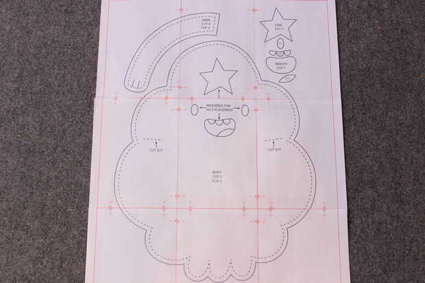 El siguiente paso es imprimir el patrón y cinta todas las piezas juntas. Las páginas están marcadas con marcas de registro para que sean fáciles de armar. Me gusta usar cinta de embalaje para hacer el patrón más resistente. También corte las ranuras para las sisas, las líneas del dedo de la mano, así como las brechas entre los terrones de fondo 3 por lo que pude marcar en mis piezas de tela.