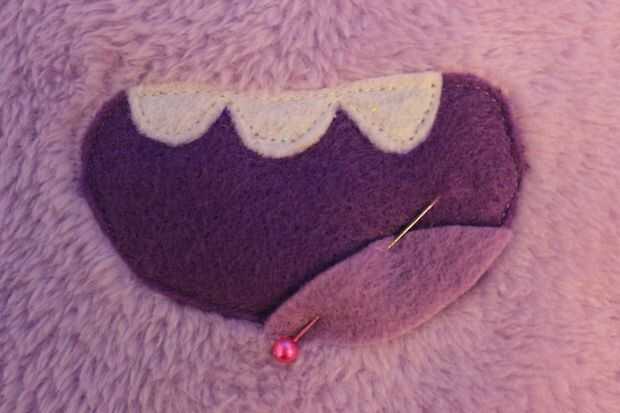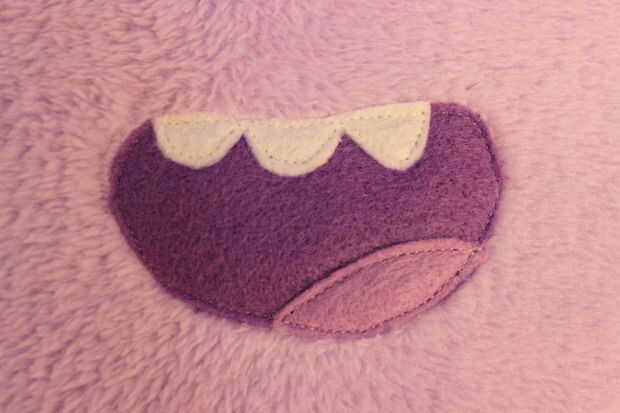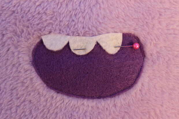 Una vez la pieza de la boca puede añadir los dientes y la lengua. Yo solo comentar su posición puesto que las piezas deberán estar alineados con los bordes de la boca. Perno en su lugar y coser la boca utilizando hilo correspondiente y una puntada recta, cose como cerca del borde como sea posible.