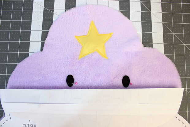 Para terminar la cara que basta con añadir los ojos, he creado otro pliegue en el patrón del cuerpo en la parte inferior de los ojos y utilizó esto como una guía para la colocación. Los ojos en lugar de PIN y coser al cuerpo con una puntada recta y coser como cerca del borde como sea posible.