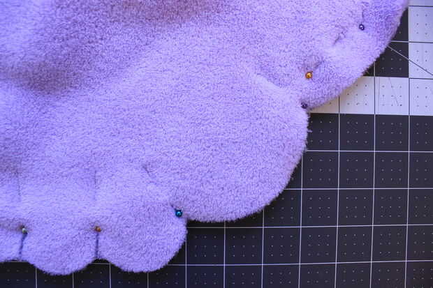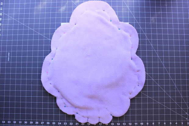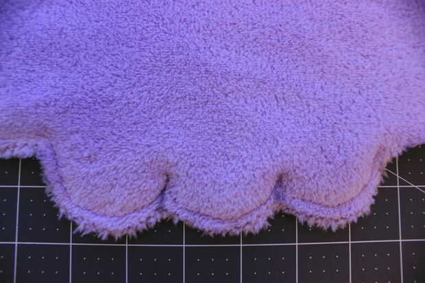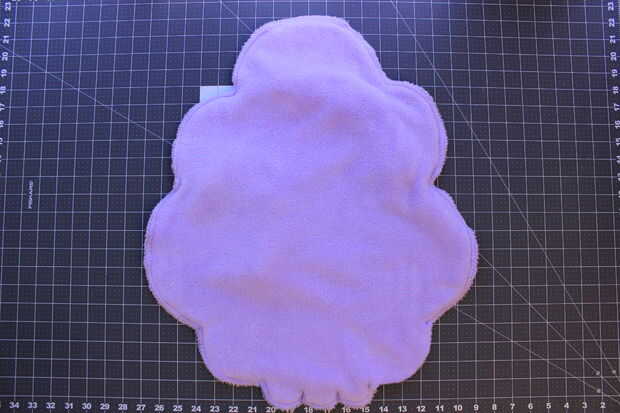 Coser las piezas con un margen de costura de 3/8" asegurándose de dejar la brecha abierta. Por las 3 bultos pequeños en la parte inferior que cosí el margen hasta un punto donde había dibujado en líneas como guía, esto ayudó a definir su forma. También he añadido una puntada de zig zag a la costura para mayor protección.