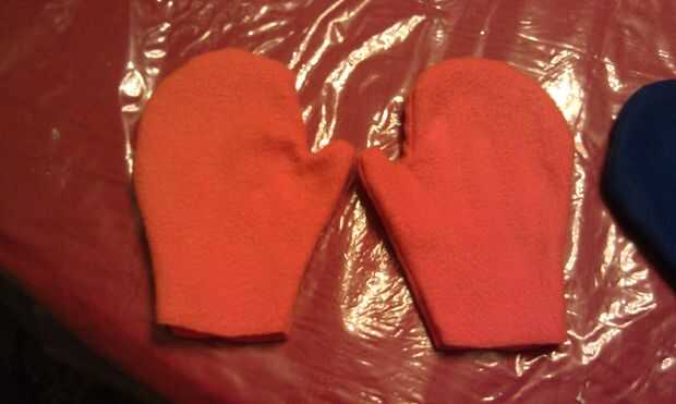 Nosotros tuvimos la suerte de tener un par de guantes traje para trazar el patrón, pero sólo debe poder trazar una manopla alrededor de la mano de su hijo y añadir un poco de todo alrededor para las costuras. Recórtalo, 2 izquierda, 2 derecha.