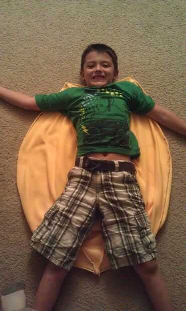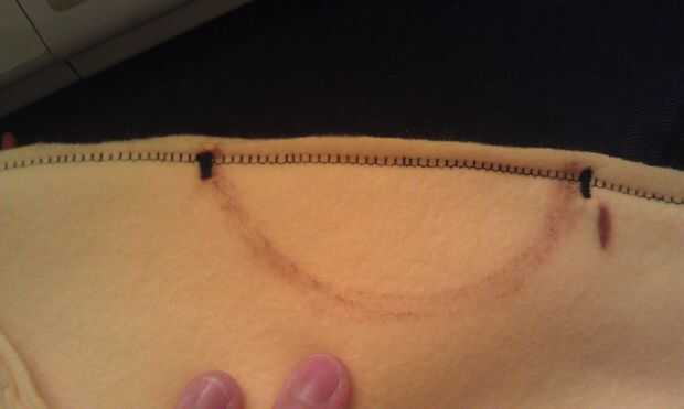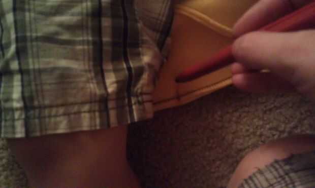 Ponen hacia fuera como antes y coloque a su hijo en él. Marque en cada lado de las piernas. Conectar los puntos con un arco como la foto.