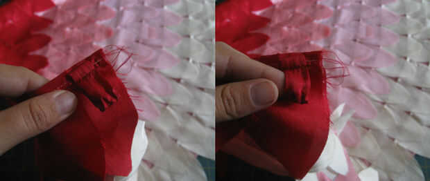 Una vez plumas todos son cosidas a su gusto, cose en dos lazos de tela para ambas alas, uno en cada extremo de la parte superior de los bordes (A).