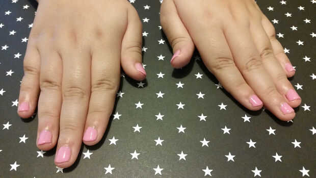 Empezar poniendo en una capa base y luego poner una capa de tu esmalte de color rosa. Si no es lo suficientemente opaco con una capa de color de rosa, hacer 2 capas.