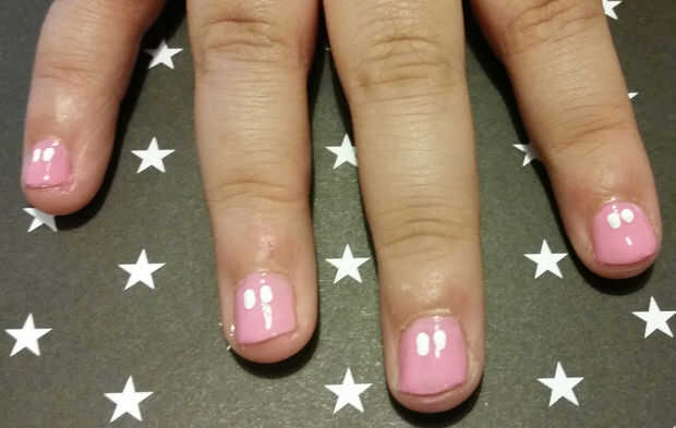 Sumerja la uña que herramienta o palillo en la pintura y hacer dos formas de tipo cilindro pequeño en cada clavo. Estos serán los ojos. Si lo prefieres que puedes hacer el diseño en una uña de acento en vez de los 5, depende de usted.