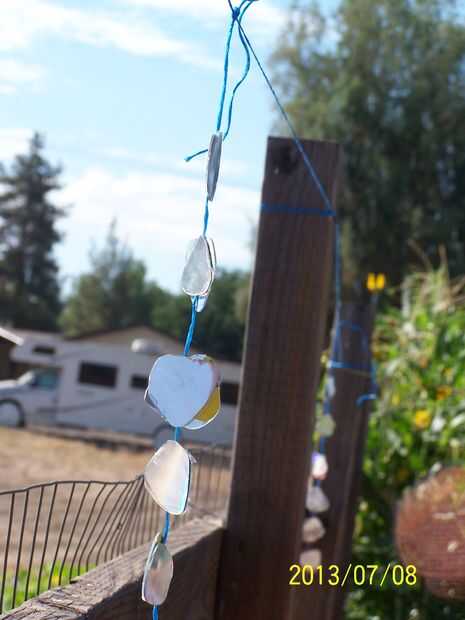 La idea era cortar el CD en pedazos, luego hilo de sandwich entre dos piezas (etiqueta en el interior, el lado brillante hacia fuera) con epoxy para celebrar juntos. Así, para cada reflector quería 2 unidades de CD y que me iba a poner de 6 reflectores en cada línea, con suficiente hilo en un extremo para atar a donde quiera que se cuelgue.