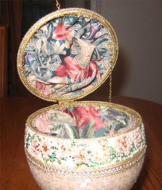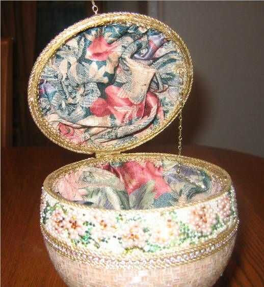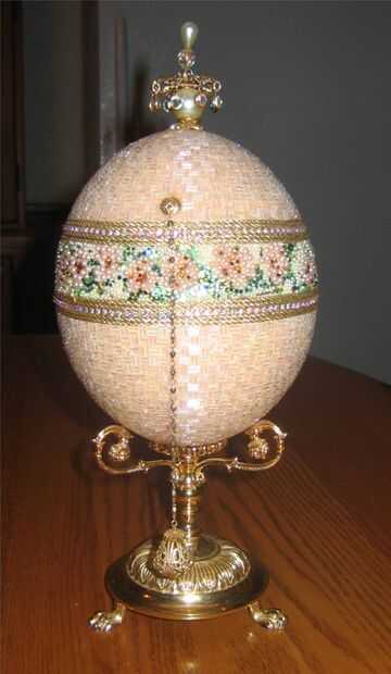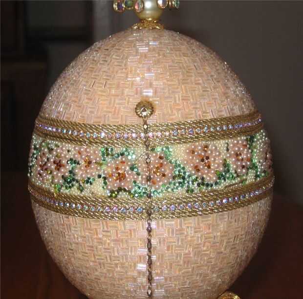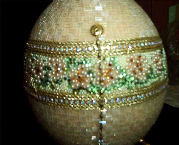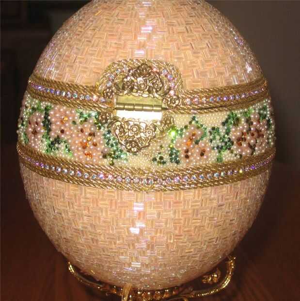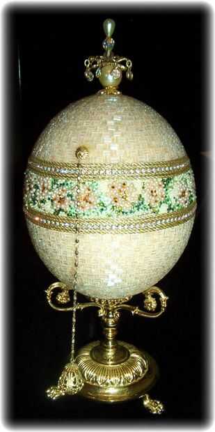 esto es una caja de joyería del huevo de avestruz. Se crea usando un huevo de avestruz, cortada y con bisagras. El huevo entonces fue moldeado, un grano en un momento. La parte superior e inferior de la cáscara de huevo de avestruz fue pintado un color melocotón. Luego fue moldeado con arora claro borialis canutillos en un patrón del basketweave. Flores y hojas se crean no utilizando agujero de perlas, perlas planas y planas de Swarovski rhinestones en la sección central de nuevo. También hay cadena del rhinestone de Swarovski y trenza cuidadosamente colocados alrededor de la línea de corte de la cáscara de huevo y entre la sección del medio y la sección superior e inferior. Se coloca un adorno de cuatro niveles de Swarovski en la parte superior del huevo. El huevo está sentado en una postura de huevo plateado oro. El huevo se abre para revelar una guarnición de tapiz.