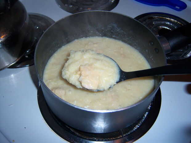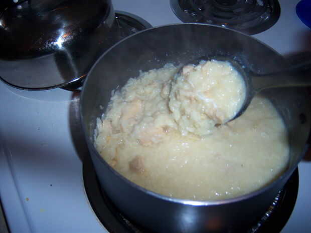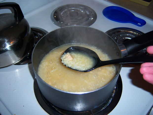 Esperando el pollo se enfríe, bien en la misma olla o en un recipiente aparte (con 2 y media tazas de la culata), devolver el caldo a hervir y agregar en la taza de arroz, reducir otra vez a un simmer (encontrar los trabajos de ajuste más bajo muy bien), cubierta y durante 15 minutos.