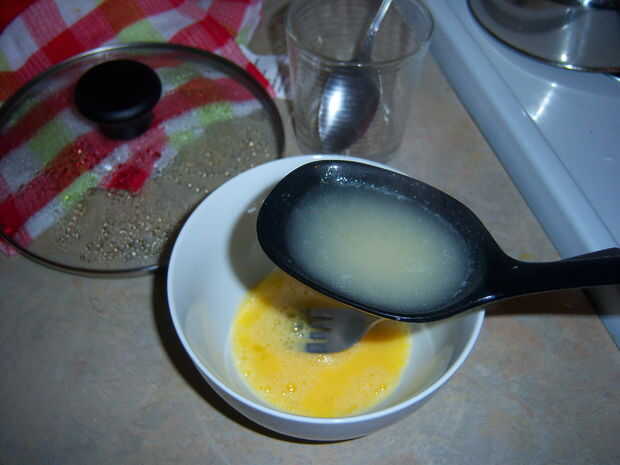 Una vez el arroz ha sido timed(certainly test), Temple del huevo con una cucharada a la vez del agua de la olla y revuelva todo en junto.