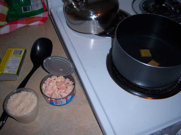1 lata de trozos de pollo (sí, usted puede conseguir pedazos de pechuga de pollo enlatadas en la tienda de comestibles, * 1$ @ ensamblándolos, o comestibles de $ 2 por una lata un poco más grande).