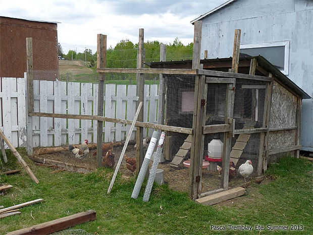 Una estructura simple de madera envuelto con malla de alambre de pollo y eso es todo... se construyó un gallinero.
