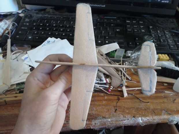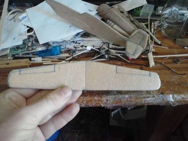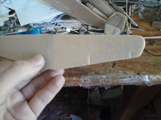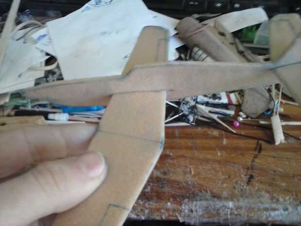 Doble de las alas hacia arriba de la línea central. [Imagen 3] Este ángulo se llama diedro. Si las alas de la cuesta hacia abajo que se llama Anhedral, pero en este modelo cuesta hacia arriba las puntas de las alas. Esto permite que el avión permanezca vertical mientras que vuela y lo contrario tendería a tambalear en vuelo.