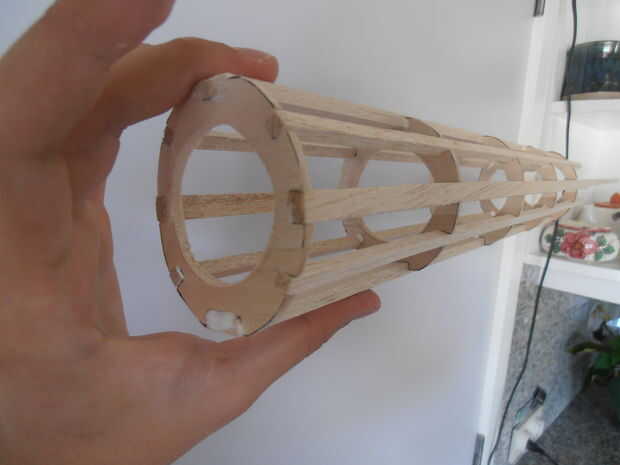 Ahora pegue la placa de la balsa (1 x 100 mm x 1000 mm) en las barras diagonales del cuerpo. Pero primero corte la anchura correcta.