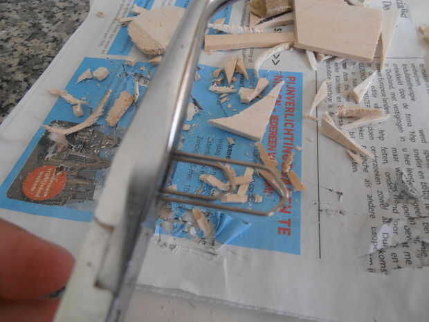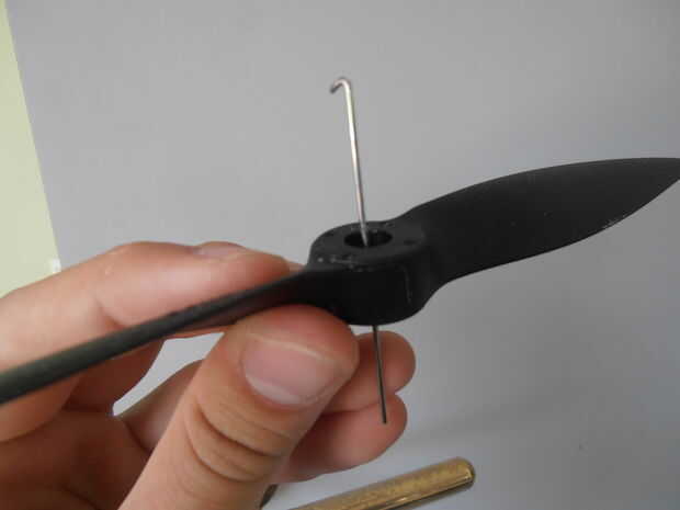 Introduzca la barra por el grano de la hélice y añadir una gota, seguida por la segunda pieza de madera de balsa.