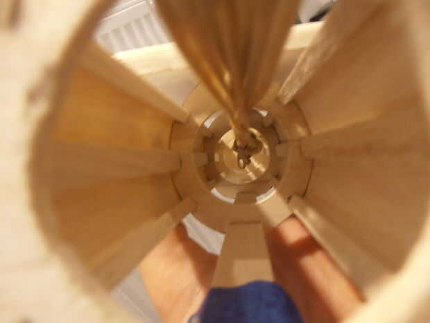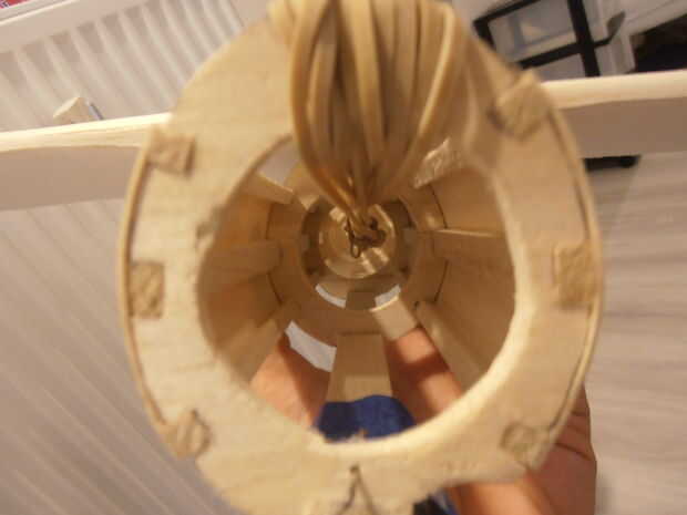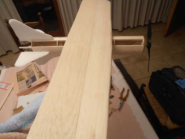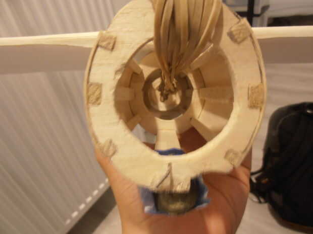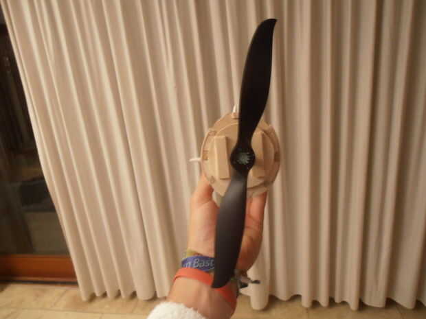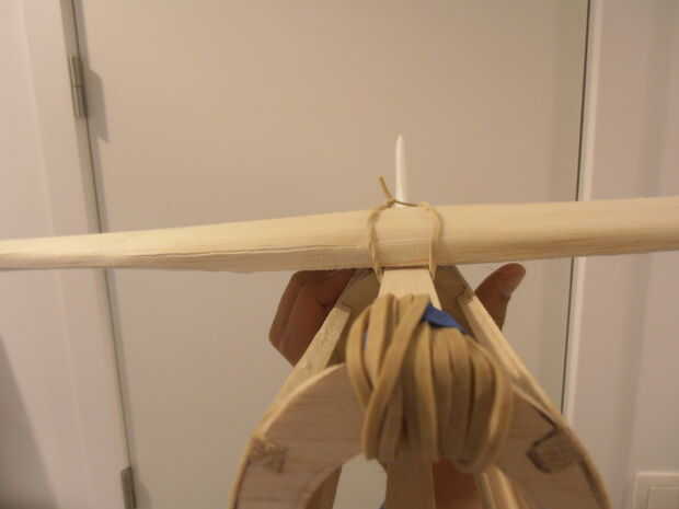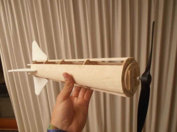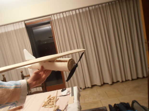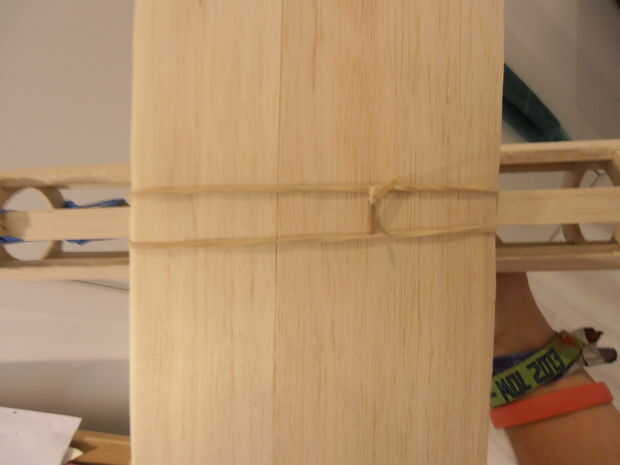 Primero pegue la parte posterior de la hélice en el cuerpo del avión y tire toda la goma a través del cuerpo.