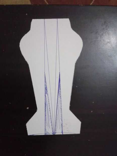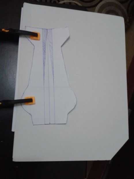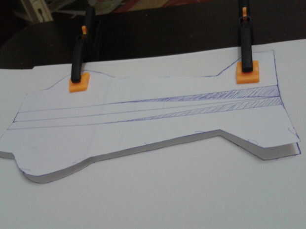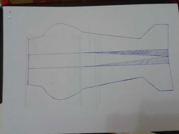 Después de dibujar la silueta del avión en una hoja A4 blanca, me cortó luego utilizar para dibujar dos copias espejadas con una pequeña distancia en blanco en el medio. Las dos copias son idénticas porque la misma silueta se utiliza como patrón.
