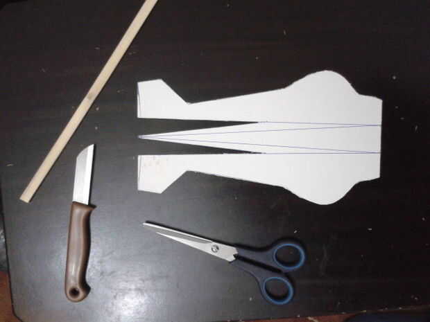 La forma en la cartulina se corta luego. Este es el fuselaje de nuestro avión.