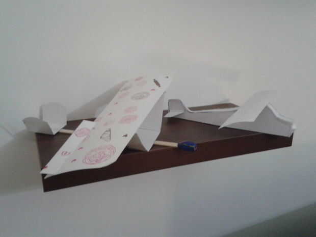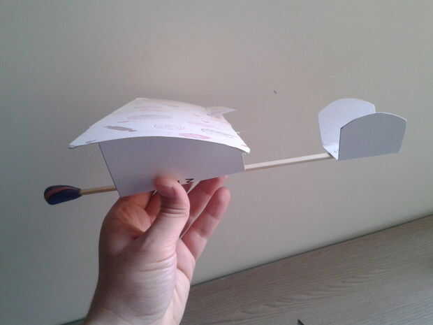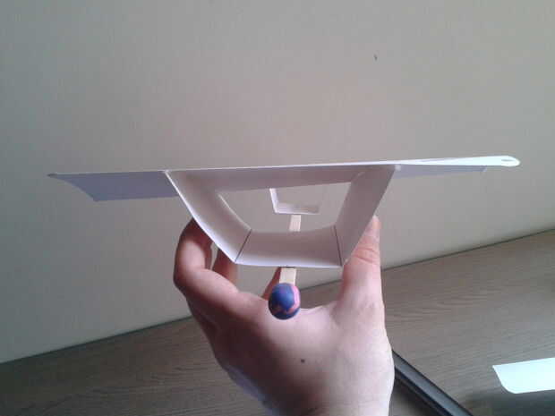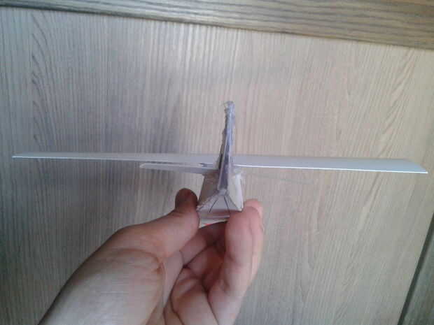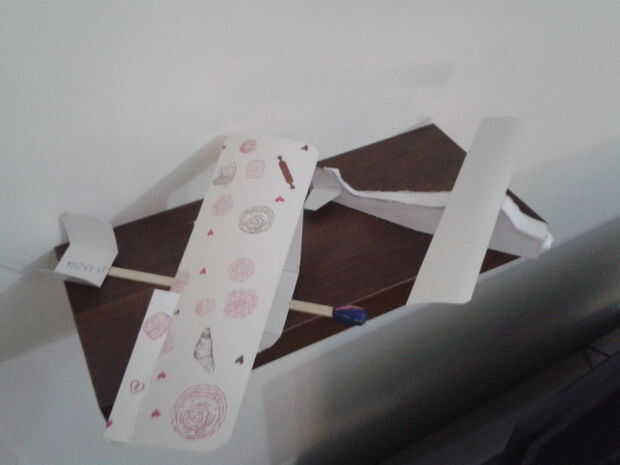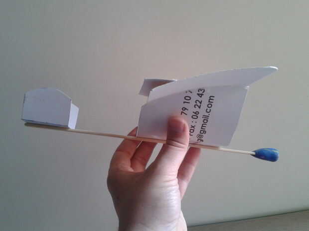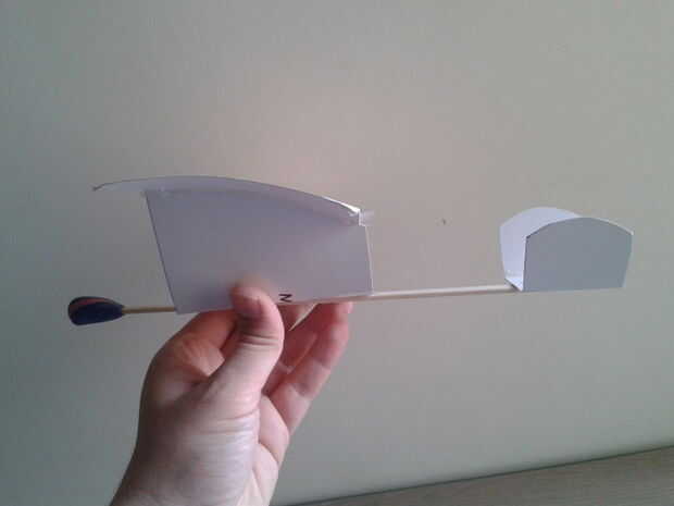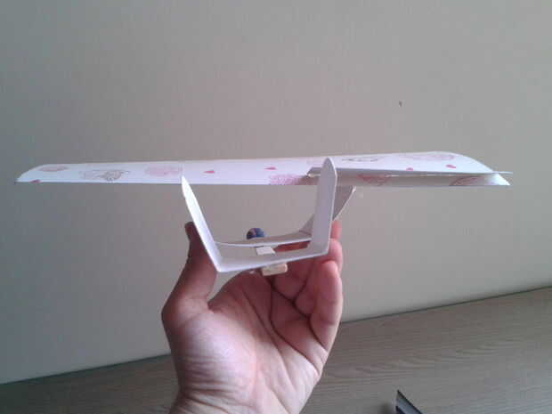 Como puede verse en la segunda figura de arriba, el ala del avión no es 100% simétrico. Esto produce giros indeseables durante el vuelo. Para superar estas vueltas, añadir alerones o aletas (un trozo pequeño de cartón) en la parte superior del ala como se muestra en la figura última anterior. Para mi avión, volarlo interior sólo y no necesita aletas debido a la distancia vuela es corta.