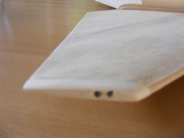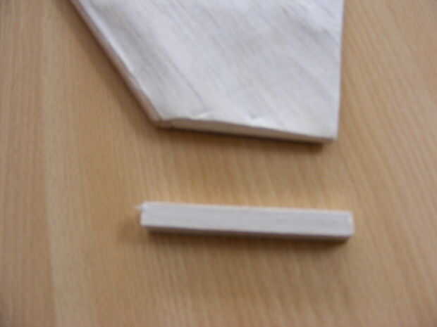 Hierop bevestigde ik een ronde staaf hout (aan de voorkant van de vleugel), en een dunne staaf balsa die afloopt (aan de binnenkant van de vleugel).