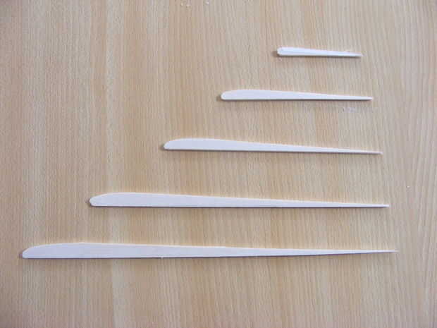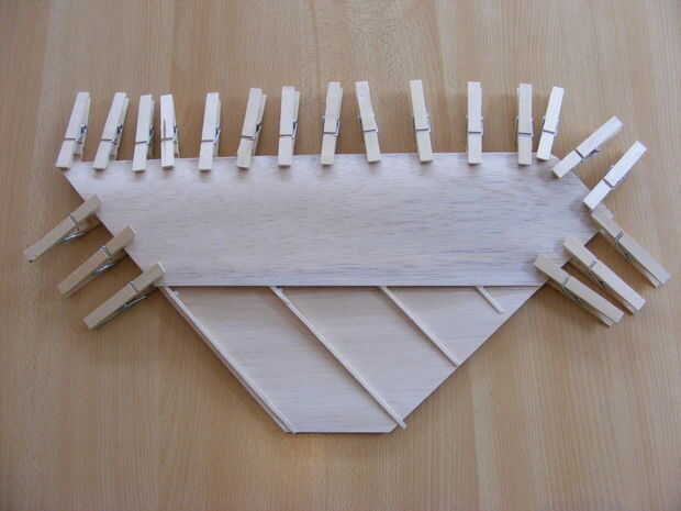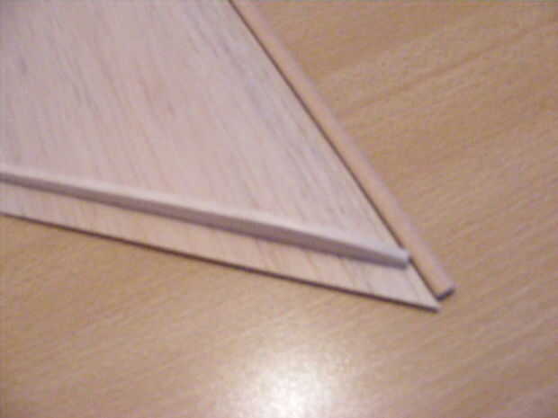 Hierna heb ik ribben uit balsa gesneden. Este kleef ik dan op de driehoeken, zodat er een vleugelprofiel ontstaat. sobre este ribben kleef ik een zeer balsa de laag dunne.