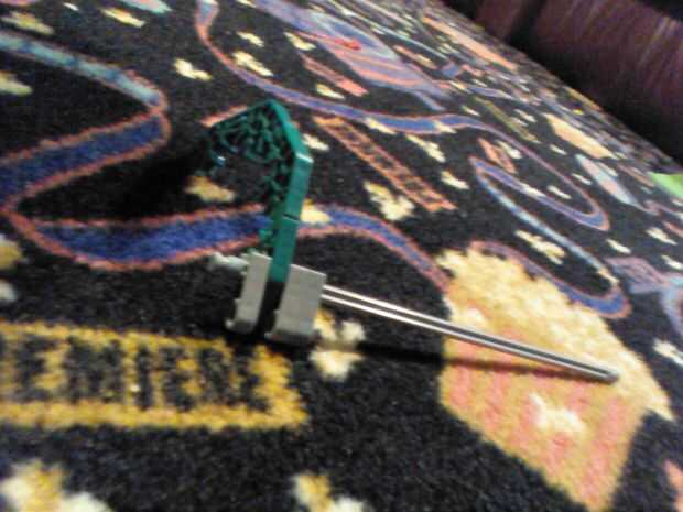 Conseguir una varilla de largo gray\orange\black y pegarlo por el final (última pieza con agujero) del agujero como se muestra. Deje un pequeño espacio para poner un conector largo gray\purple. Después de eso, poner 2 conectores gray\purple largo de la varilla de gray\orange\black largo. Asegúrese de que está justo al lado del conector de green\yellow.