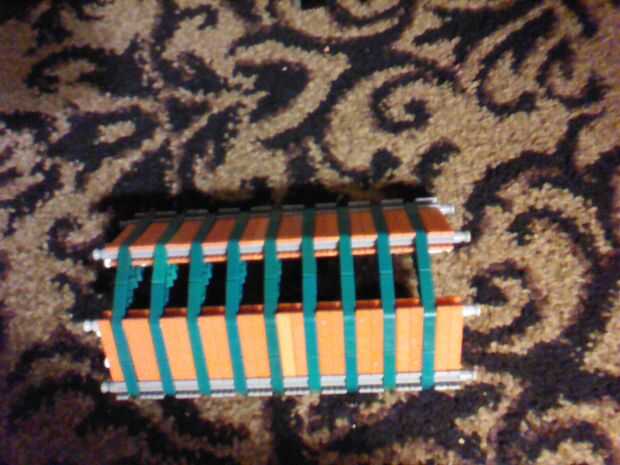 Después de este paso, poner una barra de gray\orange\black a través del orificio por encima del primer agujero del conector verde. Hacer lo que hiciste en la parte inferior pero use conectores naranja (hacia arriba, al igual que los conectores de gray\purple) en vez de conectores gray\purple. Hacer esto al otro lado.