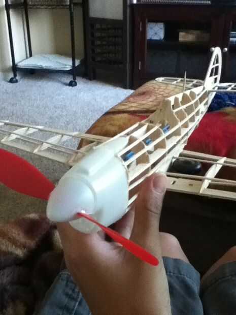Si desea volar y agregar la goma, poner con un palo de madera en el extremo y que enganche en la hélice.