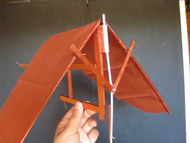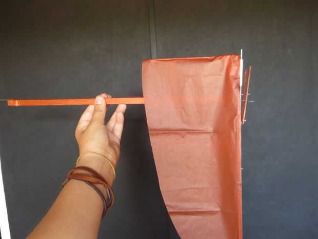 Utilice un palillo del pegamento para pegar la varilla ala balsa sobre el tejido de ala, como desliza el extremo de 2cm en el tubo correspondiente. Hacer lo mismo con la otra mitad.