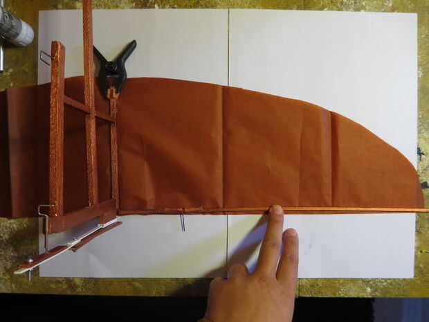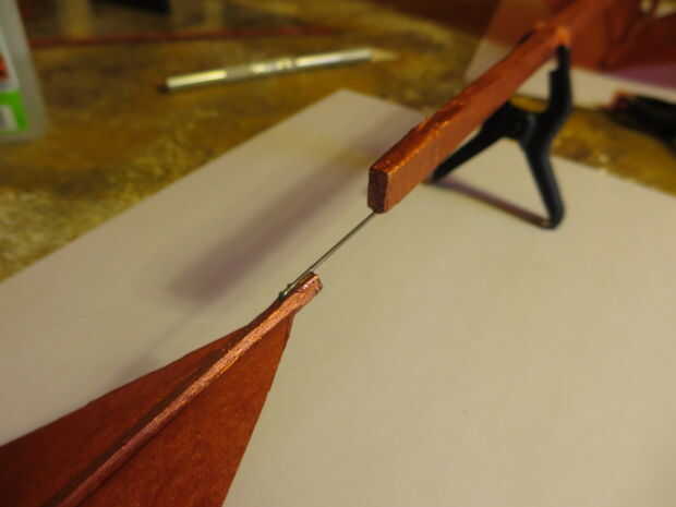 Pase el alambre final (en el extremo de la varilla de balsa de 40cm del cuerpo) por el principio - a ~ 1cm - de la cola. Asegúrese de que el cuerpo y la cola están alineados, o bien el modelo no flota directamente. Pegar el alambre a la balsa y doblar el alambre un poco hacia arriba, para que la cola hace un ángulo de 15°.