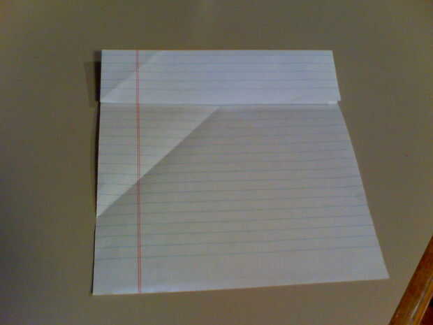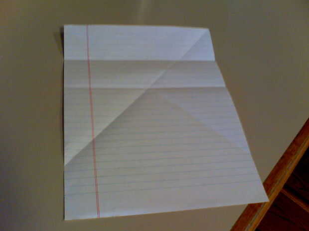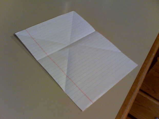 Ahora debe tener una x grande en el centro de su papel. Dobla el papel por la mitad para que toquen las esquinas superiores izquierdas y derecha hacia abajo a donde x va el papel, desplegar. Dé vuelta. Luego doblar la parte superior del papel hasta el punto de cruce de la x, revelar.