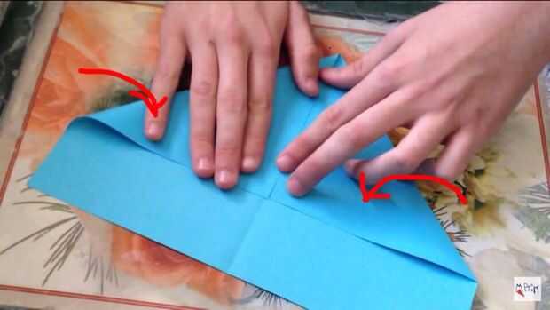 Luego doblar las esquinas del papel a la línea de la orden superior del triángulo con el pliegue central