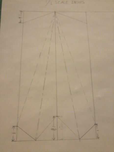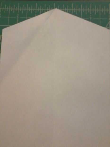 Primero dobla el papel por la mitad a lo largo de la hoja. Haga una marca de 1-1/4" desde el lado más corto en los lados más largo. Se trata de la parte delantera. En la parte trasera, haga una marca en la tapa 1-5/8" del borde. Hacer marcas de 1" del borde en ambos lados. Trazar una línea desde la marca de 1-1/4" para el pliegue de centro del borde superior. Hacer esto para ambos lados. Corte a lo largo de esta línea con las tijeras. O, cuando se utiliza un cuchillo xacto estos dos pasos se pueden cortar más cortos, simplemente cortando el papel con la dirección de la regla.