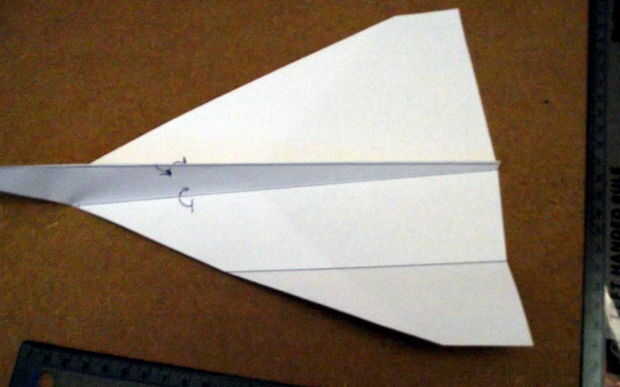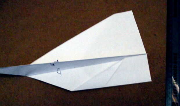 Con el plano en su parte posterior (alas abajo, centro plegar) tomar los bits planos corto en la parte posterior, los que estaban en la parte superior de la ladera y ahora están en los extremos de las alas. Doblarlas en el doblez que hiciste en el paso nueve. Así que efectivamente está doblando cada ala en dos bajo el avión. (Hacen esto para ambas alas) Asegúrese de que se pliegue bien.