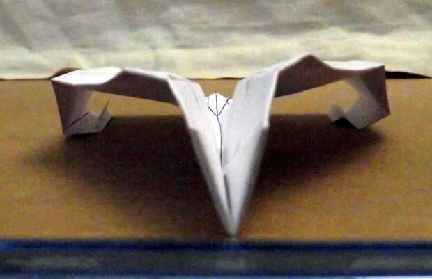 Pellizcar a los primero cuatro o cinco milímetros de la parte delantera de las alas donde encuentran las alas de la nariz. Y pliegue las alas hacia abajo un poco para crear un arco levantado encuentro el ala de la nariz dejando el resto de las alas sin cambios. Este arco sólo tiene que ser leve puede ajustar su ángulo más adelante junto con el ángulo del doblez que realizado en el paso 20 en.