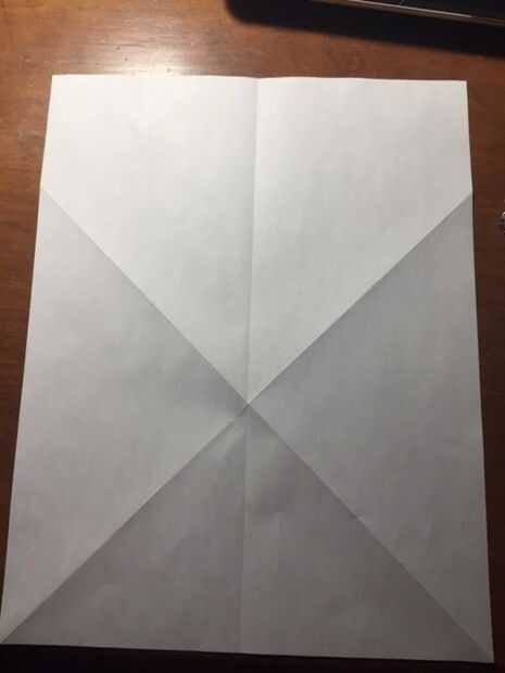 Sosteniendo el papel horizontalmente, dobla el papel en medio de la alineación del borde a borde para que el papel se forma como un rectángulo. Desdoble y coloque el papel hacia abajo con el pliegue hacia arriba. Luego, sostenga el papel en posición vertical y pliegue la esquina inferior derecha en el papel, alineando la esquina con el borde del papel. Tire que dobla hacia atrás y repetir el mismo proceso para la esquina inferior izquierda. Una "X" debe ser formada de los pliegues con un corte de la línea vertical a través del centro.