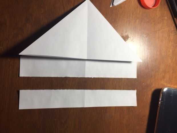 Por debajo de la nariz de triángulo que han creado, habrá un colgante ficha rectangular. Dobla esta ficha la mitad por lo que es la mitad de su ancho original. Doblar la misma ficha en el pliegue del mismo pero en sentido contrario. Aplicar un montón de presión en el pliegue que se desgasta. Ahora aplicar presión a un lado del pliegue y desaceleración rip abajo mitad lejos del resto del papel. Es importante hacerlo lentamente y con precisión, y pueden utilizarse tijeras para ayudar si es necesario.