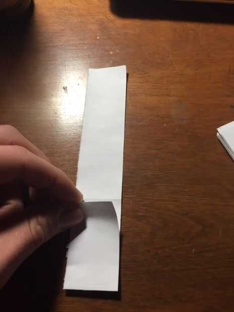 Ahora le permite centrarse en el pequeño fragmento que se convertirá en nuestra cola. Tome el pedazo rectangular de papel y doble un lado por la mitad para que el borde exterior se alinea con el pliegue en el centro del papel. Deshacer el doblez y voltea el papel. Doble el pedazo de papel por la mitad horizontalmente, formando una tira larga fina. Ahora usando el pliegue que se formó en el comienzo de esta etapa, a partir del extremo abierto de la tira fina, cuidadosamente corte que pliegue hasta justo antes de se desprende.
