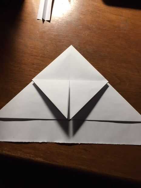 Ahora coloque la pieza de cola a un lado y sacar el pedazo más grande de papel que usted comenzó con. Doblar las esquinas inferiores derecha e izquierda del triángulo (sólo una capa de papel) para que alinee con el punto central y la línea central. Tomar las dos aletas nueva que acaba de crear y cada uno de ellos dobla por la mitad del punto en el centro. Esto formará un rombo si se hace correctamente y entonces puede ser doblada hacia atrás. Ahora usando las aletas del mismo, tomar la derecha y doble hacia la línea central para que el borde esté perfectamente centrado. Hacer el mismo paso a la izquierda. Coloque estos pliegues hacia donde estaban y ahora doblar las esquinas inferiores hacia la línea de centro de formación de la misma forma, pero boca abajo como se muestra. Ahora se despliegan a la forma del diamante.