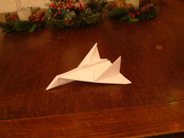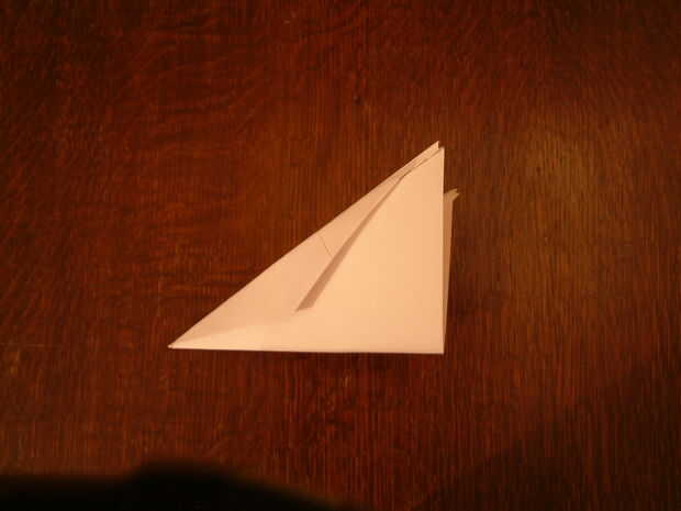 4 y 5. Doblez de la punta de ala superior arriba de donde la tapa frontal superior con el ala debajo de él (mantenerlo en línea con la línea posterior del viento por lo que está parado recto y perpendicular al cuerpo del avión.