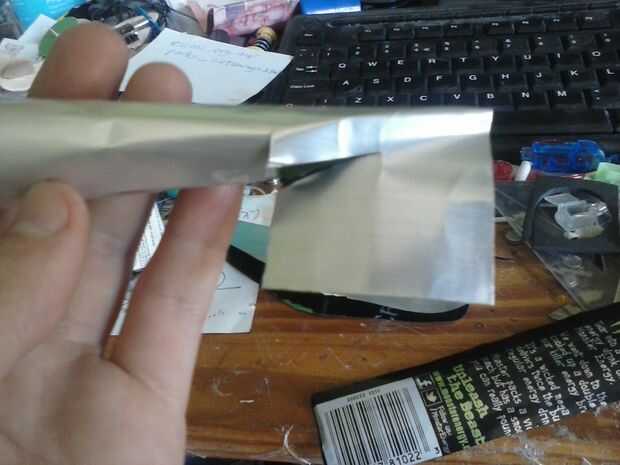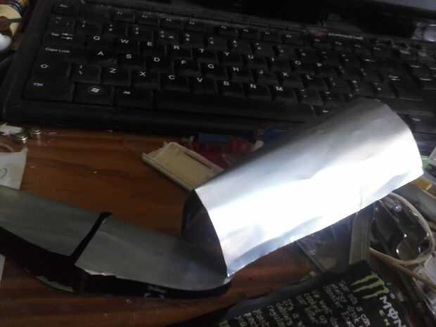 Doble (lateral) esta pieza (uno grande) por la mitad y sólo una pizca del metal en un extremo como se muestra en los cuadros primeros y segundo. Corte una raja de unos 3 a 4 cm de largo, aproximadamente un tercio a lo largo del extremo pinchado (cola). Repetir este proceso en el otro lado. Esto más tarde formará el estabilizador horizontal.
