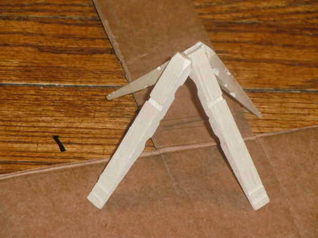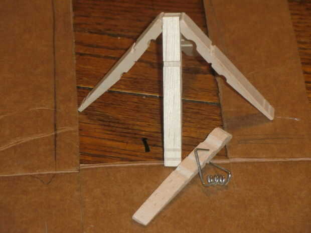 3. Pegar dos de las pinzas para la ropa juntos, de punta a punta, en forma de triángulo. Las grandes muescas en la madera deben ambos ser uno frente al otro.