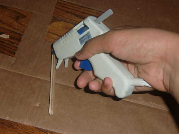 1. Ahora es el momento para hacer las extremidades de la ballesta. Pegue dos palitos al lado. Repita este paso tres veces más hasta tener cuatro pares de palitos.