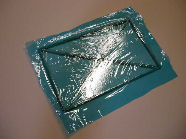 Había planeado originalmente pegar unos palos a los bordes de la hoja de la película para crear un marco para Tire firmemente, pero descubrí que realmente no necesitarlo. Coloque la pieza de la película sobre el marco como lo haría con el tejido. No tire lo suficientemente apretada como para estirarla, pero asegúrese de quitar cualquier arruga antes de permitir el pegamento seco. Si dejas una arruga en, se mostrará, incluso después de reducirlo hacia abajo. Una vez abajo, pase