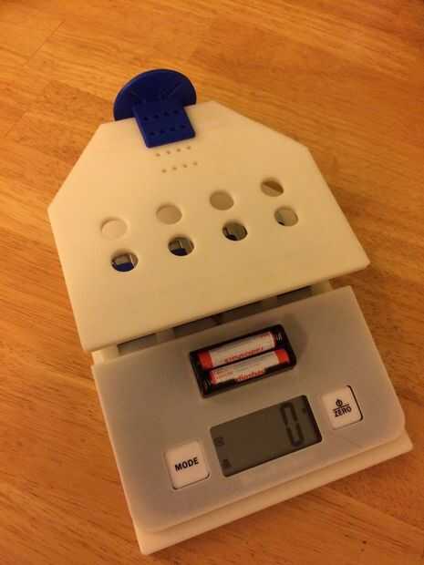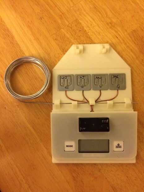 Se adjuntan los archivos STL. Imprimir o pídale a alguien que imprime los archivos adjuntos de 3D para usted. La base está hecha de 3 piezas para hacerlas más imprimible, les pegan cuando termines. La escala se ajusta debajo de la cubierta y encaje en la placa posterior. La fuerza de medición de las placas de ajuste en bolsillos en la sección de centro. Asegúrese de que el adhesivo que cubre el sensor es cara abajo en el bolsillo. Hay un lugar para el sostenedor de batería AAA 2 y pase a través. He comprado 12GA alambre de aluminio de una tienda de artesanía local como el material del perno de bisagra (se muestra en la imagen y se deslizó en su lugar sin las bisagras). Es suave y fácil de alisar. Cuando termine, asegúrese de que las bisagras se mueven suavemente. Si no puede trabajarles hacia adelante y hacia atrás un poco y el aluminio trabajará en recto. Montaje del motor, que se muestra impreso en azul, se monta en el frente de la tabla con tornillos y tuercas.