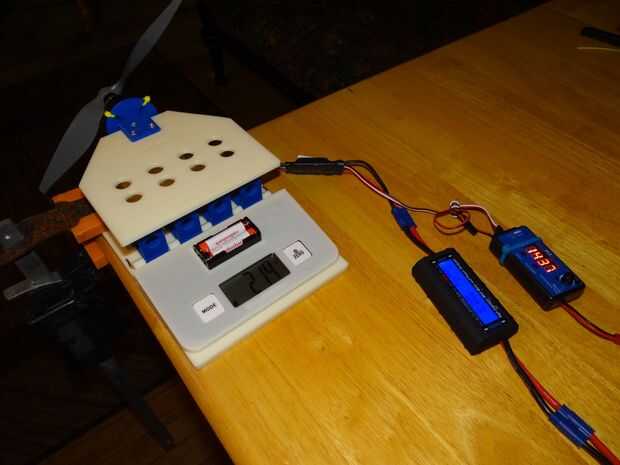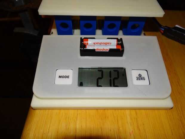 Aquí está una vista de la configuración corriente. La cámara utiliza un flash por lo que el apoyo es congelado en el tiempo y no muestra desenfoque, pero funcionaba. Se puede ver que estamos midiendo 212grams de empuje para el servo de entrada proporcionado. Tenga en cuenta que solía atar urdimbres en esta configuración mantenga el motor, pero no sugiero esto como una buena práctica. Solo hice esto para tomar unas cuantas fotos de trabajo para mostrar; uso real y las tuercas, ser responsable.