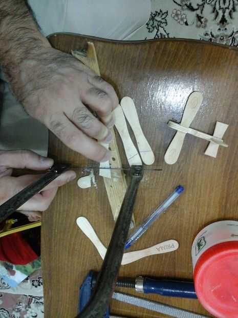 • En la tercera foto, como veis, utilizo el primer palillo otra vez para marcar el palo adelante para timón vertical, uso máximo 40% de la longitud del palo para timón vertical incluyen la parte que está oculta dentro de body.so principal puesto casi verticalmente (con cerca de 70 ~ 80 grados como se mencionó anteriormente) al borde del final del primer palillo y dibujar una línea en él mediante la intersección con el borde inferior del primer palo. Ahora a cortar este palo.