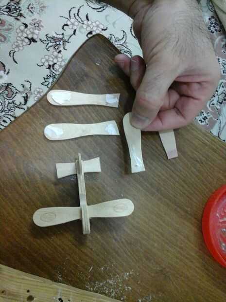 • Ahora tenemos 4 listo para enlazar sticks.the primer palillo cortamos, en el centro del cuerpo principal y segundo y tercer palo en ambos lados de ella, y tenemos un lugar vacío en la capa media de timón vertical. Ligarlos utilizando pegamento de madera como la primera foto en este paso se muestra.